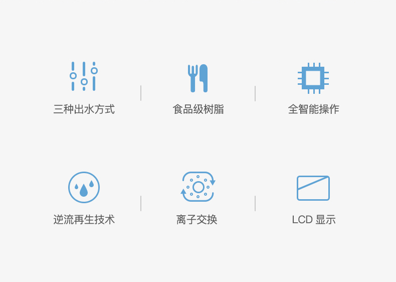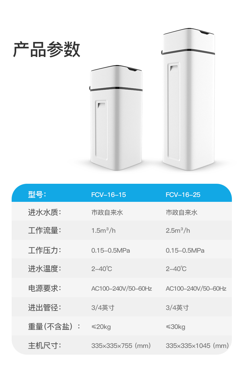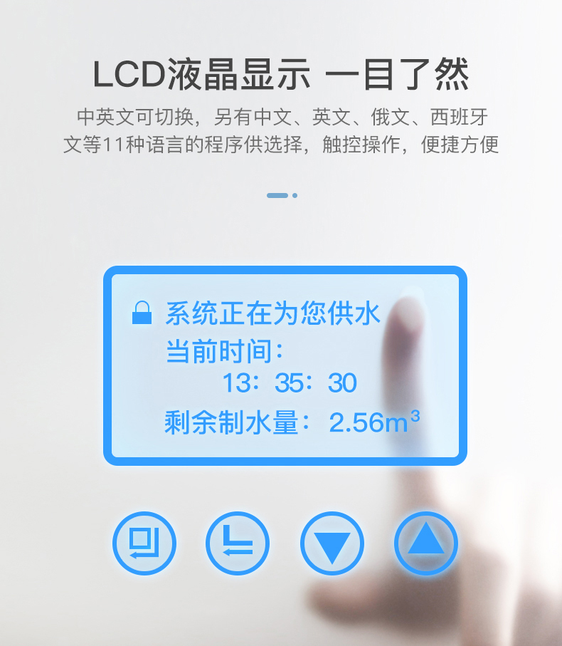 ·食品衛生級高容量交換樹脂,效果好,壽命高采用LCD大屏幕顯示,中英文等多國語言可選